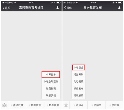 3、手机端查询方式:微信关注“嘉兴市教育考试院”或“嘉兴教育发布”微信,点击“中考查分”按钮即可查分。