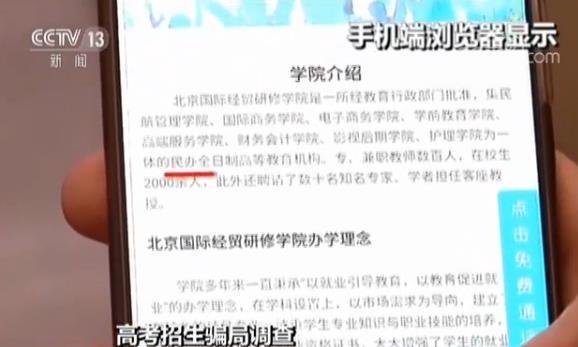 记者:如果这个学校它做这种官网,它这种非法网站,或者这种虚假宣传行为,到底是归咱们教委管,还是归网信部门管? 北京市教委民办高等教育处工作人员:因为就是咱们都是谁审批谁管理,就是这个学校不是我们审批的,所以就是我没有权限去管理它。 记者:那这个学校是谁审批的? 北京市教委民办高等教育处工作人员:不知道它是谁审批的,有可能是工商或者就是非法办学。 记者:您说北京民族工艺学院不是咱们审批的是吗? 北京市教委民办高等教育处工作人员:这个学校就不是北京市教委批的,就是您说它是民办的,可是我们民办高等教育里边没有这个学校。我不知道它是不是比如说像职业培训这种,有可能就是人力社保局批的,或者是说它就是一个普通的培训学校,可能就是在区里边的教委审批的,就是我只能跟您说这个学校不是高等教育,但是它具体是谁审批的,我这边就没法给您查的。 微信公众号 手机网页成骗局重灾区 北京民族大学作为非学历教育机构,通过新建网站改头换面,用“综合性大学”的幌子吸引了像小毛这样一批考生。而通过调查记者发现,伴随移动互联网的快速发展,一些非学历教育机构的虚假宣传手段也在不断更新,除了自建虚假大学的网页,还利用用户习惯使用手机浏览器搜索的习惯进行虚假宣传,精准行骗。