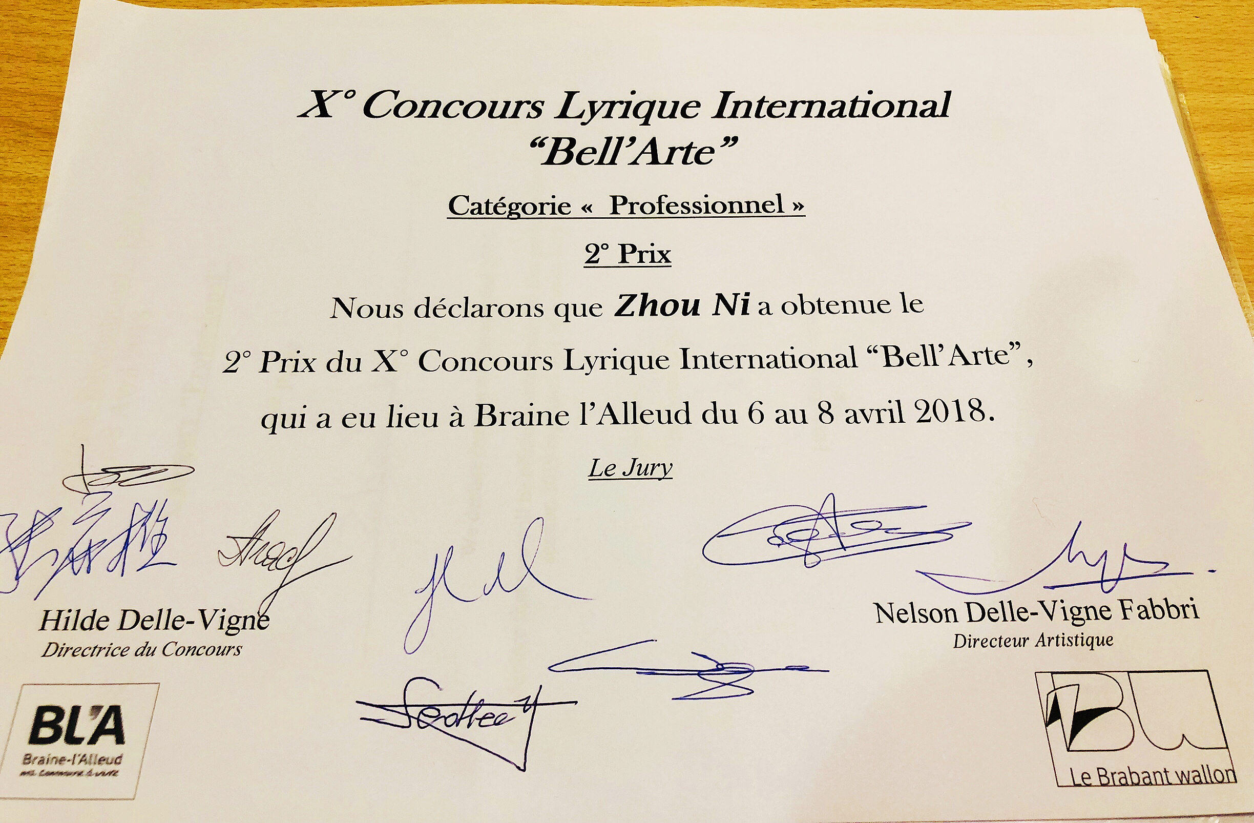 “贝尔艺术”国际音乐比赛作为LyricA Braine l'Alleud 艺术节的一部分,由比利时贝尔基金资助以支持世界各地有前途的音乐家,为他们提供展示才华和开拓未来职业生涯的机会。最初创办时以钢琴比赛引人注目,后于2008年开始加入声乐赛事,本届比赛于2018年4月6日至4月9日在布莱恩阿洛伊德举行,分别设立第一、二、三名和荣誉奖,由活跃在国际舞台的著名歌唱家出任评委,最后共有10位选手入围决赛。经过激烈的角逐,周旎获得第二名,许洋获得贝尔艺术荣誉奖(第一名和第三名分别是来自俄罗斯和荷兰的两位女高音Anna Semenyuk与Kouwenhoven Esther)。他们被邀请参加2019年比利时的L’Eté Mosan音乐节和LyricA Braine l'Alleud 艺术节和2019年F.M.I.意大利基金会主办的声乐训练营和歌剧音乐会。