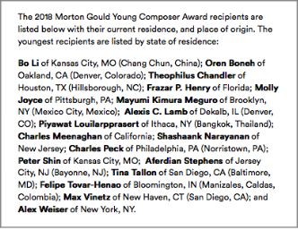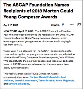 2018年4月17日,我院作曲系校友李博荣获由美国作曲家作词家出版家协会(ASCAP)主办的莫顿古德全美青年作曲比赛(Morton Gould Composition Competition for Young Composers)的获奖者。
