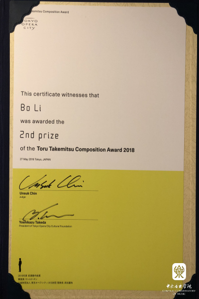 我校作曲系校友李博的大型管弦乐作品“Sleeping in the Wind”《无脚鸟》在2018年武满彻国际作曲比赛中获得二等奖,其他三位获奖者分别来自英国,德国和巴西/美国。本次比赛的唯一评委是著名现代音乐作曲家Unsuk Chin(陈银淑)。决赛音乐会于5月27日下午3点在日本东京歌剧音乐厅举行,由Yoichi Sugiyama执棒,东京爱乐交响乐团世界首演。